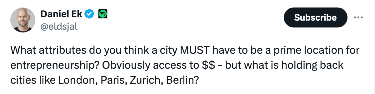 Zakladatel Spotify a další příspěvek z populární kategorie Evropa vs USA. Kromě odlišné kultury (vnímání rizika a selhání) nejvíce odpovědí uvádí změnu regulace. Co brání Praze, aby byla špičkovým místem pro technologické podnikání a AI?