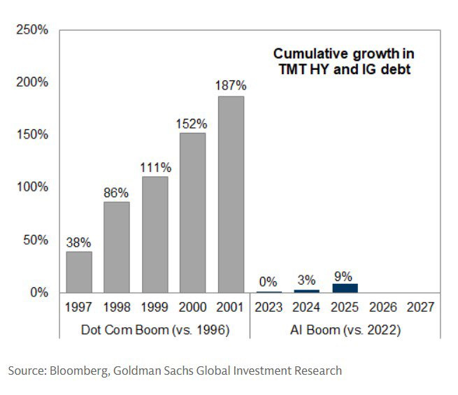 Často se straší opakováním prasknutí bubliny z roku 2000. Zaujal mě tento graf, který ukazuje, že hrajeme jinou hru. Tehdy si firmy na růst musely půjčovat (šedé sloupce). Dnes? Google, Meta, Microsoft a spol. to táhnou primárně z vlastní kapsy (modré sloupce). Nízký nárůst dluhu = mnohem menší riziko systémového krachu.