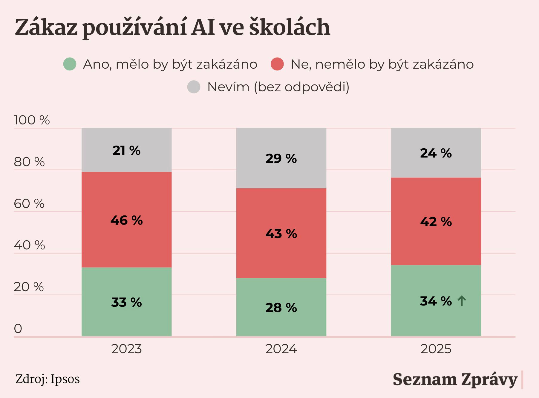 Zaujal mě také průzkum Monitor vzdělávání od agentury Ipsos, podle kterého po loňském poklesu opět vzrostl počet Čechů, kteří by používání AI ve školách zakázali, aktuálně si to přeje už 34 % z dotázaných.