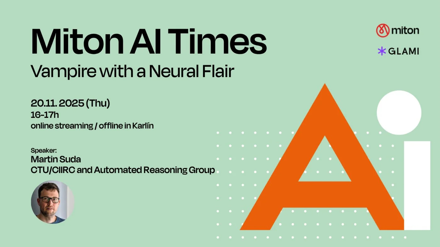 Již zítra se uskuteční další Miton AI Times, kde bude prezentovat Martin Suda, vedoucí výzkumné skupiny Automated Reasoning Group. Jeho výzkum se zabývá automatizovaným uvažováním, strojovým učením a jejich kombinací pro matematické důkazy. Akce se uskuteční v Truhlárně Karlín, ale můžete ji sledovat i online.