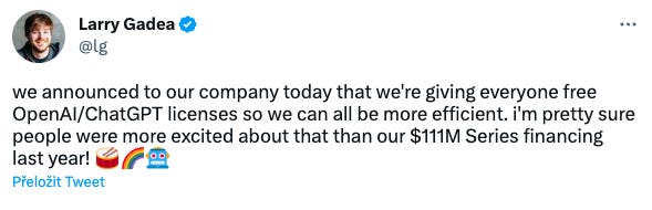 Jeden v ČR zatím příliš nerealizovaný přínos je nabídnutí ChatGPT Plus (či GitHub Co-pilotů nebo jiných služeb) jako benefitu pro zaměstnance. V zahraničí jde o začínající trend, v Čechách toho při hledání na Jobs nebo StartupJobs moc nenajdete.