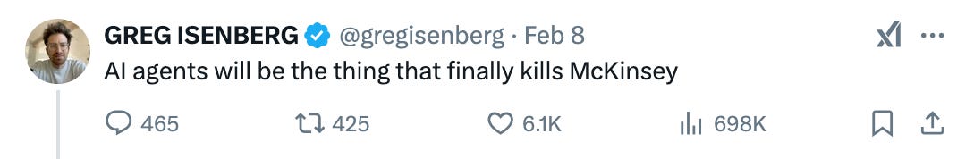 Elad Gil nedávno sdílel svůj starší článek o firmách, které indexují trh, trend, nebo technologii. A AI kromě Nvidie a dalších čipových hráčů či big tech indexují i konzultační firmy, pro které je AI značným pohonem tržeb - pro McK prý 40 %.