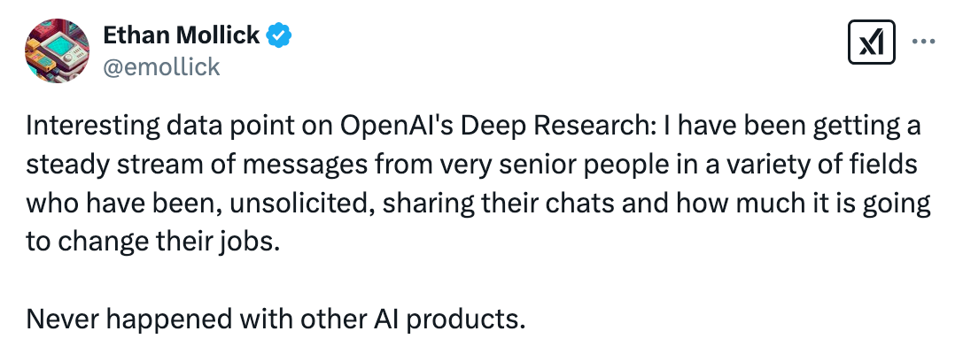 Ukázkou výstupu budiž virální příspěvek o 20 pozicích, které dle deep research nahradí AI. Co dalšího mu můžete zadat? Od nalezení nejlepšího produktu pro vaši potřebu po sestavení tržní mapy, analýzy konkurence, či identifikaci nejlepších nástrojů a AI workflows pro vaši pracovní funkci či odvětví. Prakticky jakákoli analytická či výzkumná úloha, ale i potřeba řešení problému zahrnujícího uvažování + externí zdroje, je pro deep research vhodná. A nejen externí: v rámci kontextu můžete přiložit i své soubory jako PDFs, se kterými bude deep research rovněž pracovat.