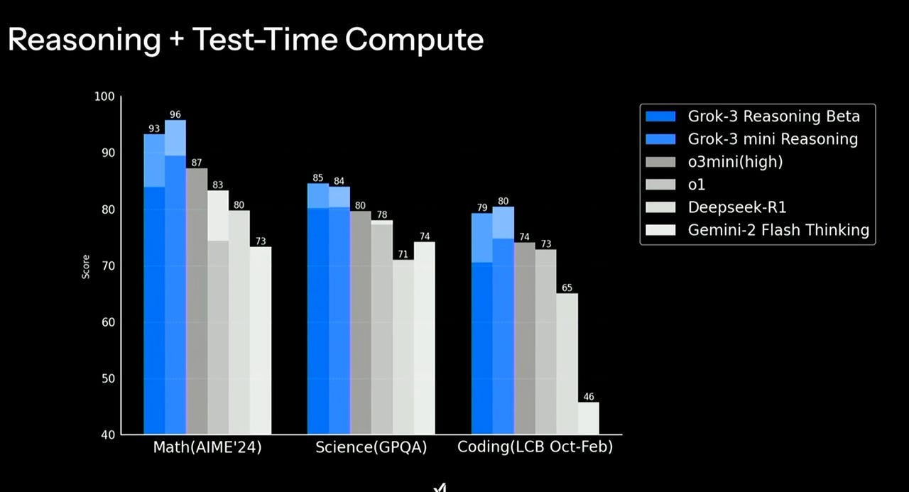 Grok 3 trénovali pomocí obrovského superclusteru s 200 000 GPUs. V mnoha benchmarcích překonal přední modely - GPT-4o od OpenAI, Claude 3.5, DeepSeek V3 a Gemini 2 Pro - a stal se vůbec prvním modelem, který v testu Chatbot Arena dosáhl skóre 1400 bodů. Dokonce i Grok 3-mini dosáhl značného úspěchu, když se vyrovnal ostatním modelům v matematických, vědeckých a kódovacích benchmarcích nebo je porazil.