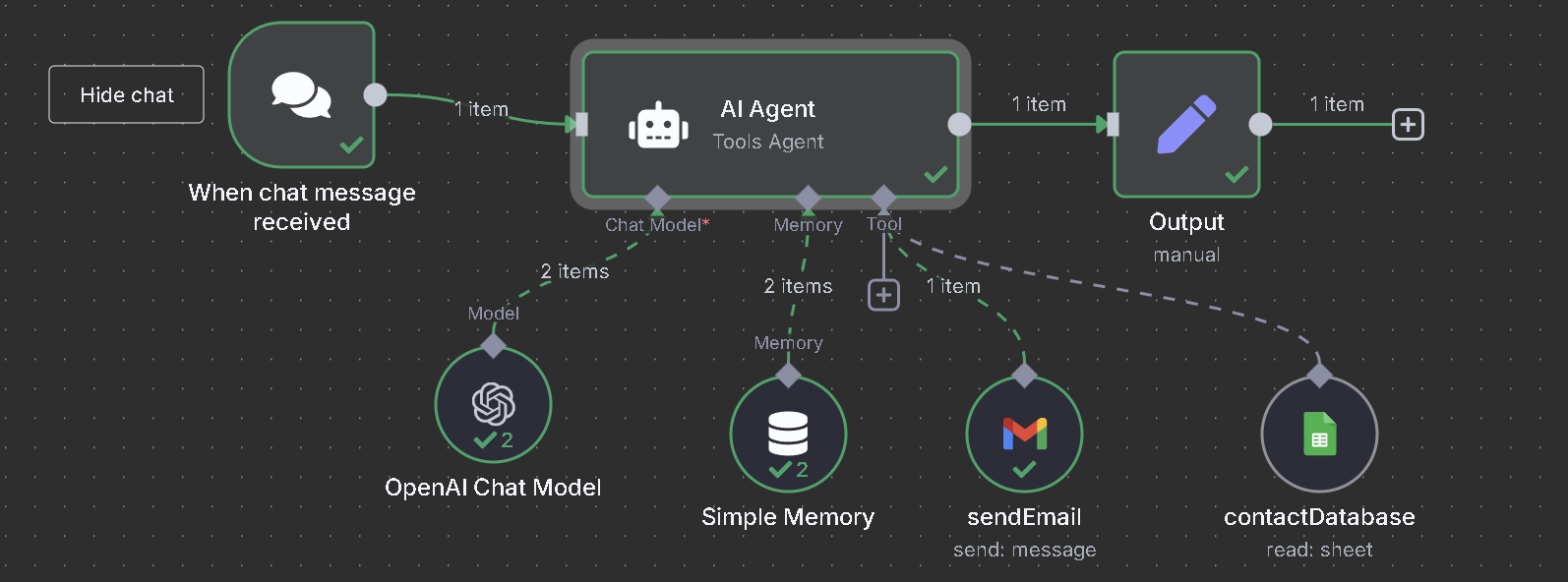 Workflow uložte a aktivujte. Nyní, když agent obdrží příkaz (např. zprávu přes Whatsapp), pošle dotaz modelu a pak provede definované akce dle jeho odpovědi.