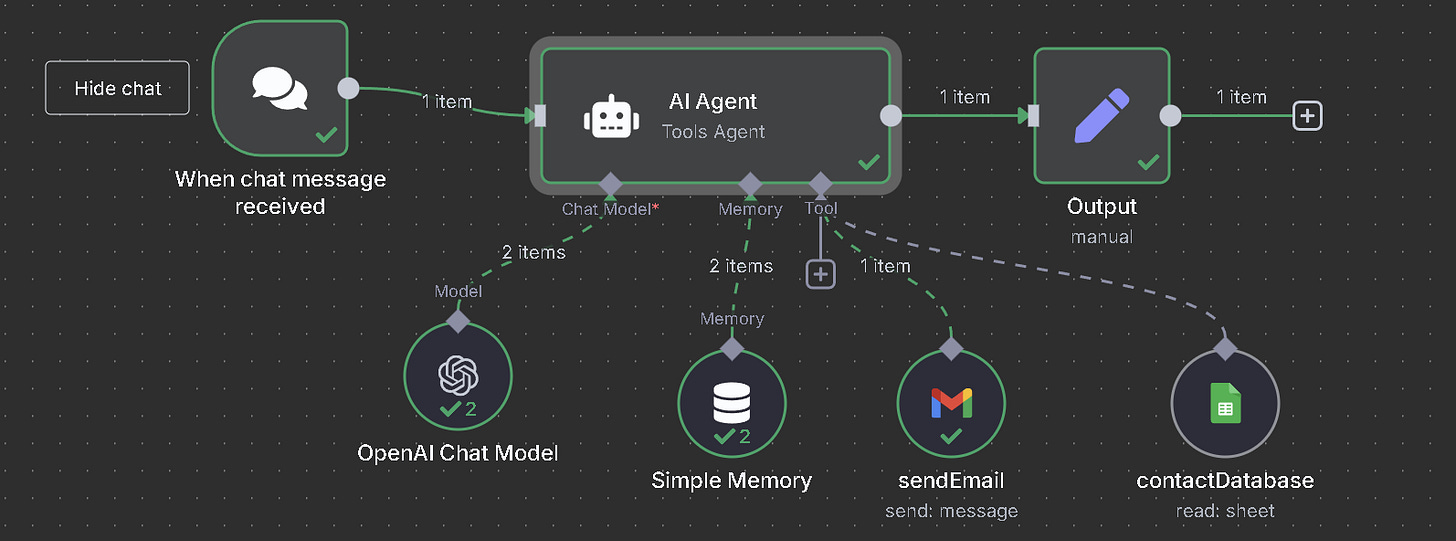 V n8n můžete AI agenta sestavit jako běžný workflow z jednotlivých uzlů. Příklad postupu: