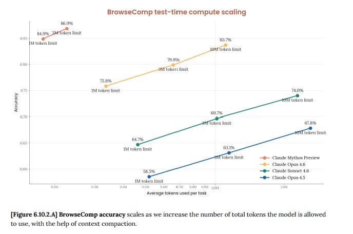 A právě tím se dostáváme k tomu nejzajímavějšímu, modelu Claude Mythos. Z interního paperu a zveřejněných dat je jasné, že Anthropic stvořil monstrum. Při limitu pouhého 1M tokenů dosahuje Mythos v BrowseComp benchmarku přesnosti 84,9 %, zatímco předchozí Opus 4.6 se při stejném limitu zastavil na 75,8 % (a Sonnet 4.6 dokonce pod 65 %).